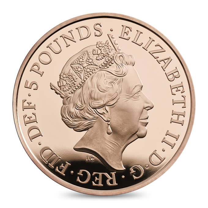 Britské pamětní mince věnované královského rodu nesou nominální hodnotu 5 liber a mají společný design. Námětem mince je mírně stylizovaný erb rodu Windsorů, jehož původní podobu schválil Jiří VI v roce 1938. Erb zobrazuje věž hradu Windsor, na které vlaje královská standarta. Design je po stranách doplněný dubovými větvičkami, které odkazují k lesu obklopujícímu Windsorský hrad. Nad hradní věží je umístěná královská koruna. Designér Timothy Noad vzhled erbu částečně upravil, aby při použití na minci lépe vynikl a působil tradičním dojmem, který má podtrhovat historii a kontinuitu královského rodu.
