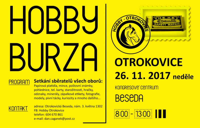 Společně s Hobby Otrokovice Vás srdečně zveme na setkání sběratelů všech oborů, které se bude konat v neděli 26. listopadu 2017 v Otrokovicích. Akce bude probíhat od 8:00 do 13:00 hod. v Kongresovém centru Beseda. Na své si přijdou filatelisté, numismatici, sběratelé mincí, pohlednic, odznaků, pivních tácků a dalších artiklů. Těšíme se na viděnou v Otrokovicích!