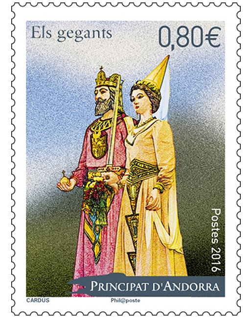 Postavy tzv. gegantů, obrů, jsou nedílnou součástí katalánského folklóru. Jde o figuríny králů či aristokratů oblečené v tradičním místním oděvu. Figuríny obvykle zpodobňují patrony města či vesnice a používají se při lidových festivalech. Námět gegantů nalezneme na známce o nominální hodnotě 0,80 € z dílny designéra Carduse Enrica. Známka, která zobrazuje zdobně oblečené geganty, byla vydaná 11. června 2016.