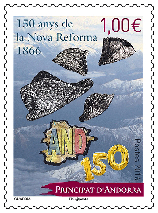 V roce 2016 si Andorra připomínala uplynutí 150 let od schválení Nové reformy, která demokratizovala andorrskou samosprávu. Známka k této příležitosti vyšla 23. dubna 2016, přičemž Nová reforma byla schválená o den dříve v roce 1866. Známka o nominální hodnotě 1 € zobrazuje propracované pokrývky hlavy, které tradičně nosí členové samosprávy. Na pozadí známky podle výtvarného návrhu Heleny Guardiaové se nachází pohled na typickou andorrskou krajinu.