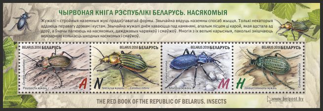Hmyz vyobrazený na čtyřech různých známkách vydaných běloruskou poštovní správou patří v Bělorusku mezi chráněné druhy uvedené na Červeném seznamu. Jednotlivé známky zdobí střevlík měděný, střevlík lesklý, střevlík vrásčitý a střevlík mřížkovaný. Detailně vykreslení střevlíci kontrastují s jednoduchým zemitě zbarveným pozadím známek. Známky nesou různé nominální hodnoty, označené písmeny, a každá vyšla v nákladu 42.000 kusů. Všechny čtyři známky se nacházejí společně i v aršíku (MiNr. 1104-1107, Block 133), který obsahuje doplňující informace o zobrazených druzích.