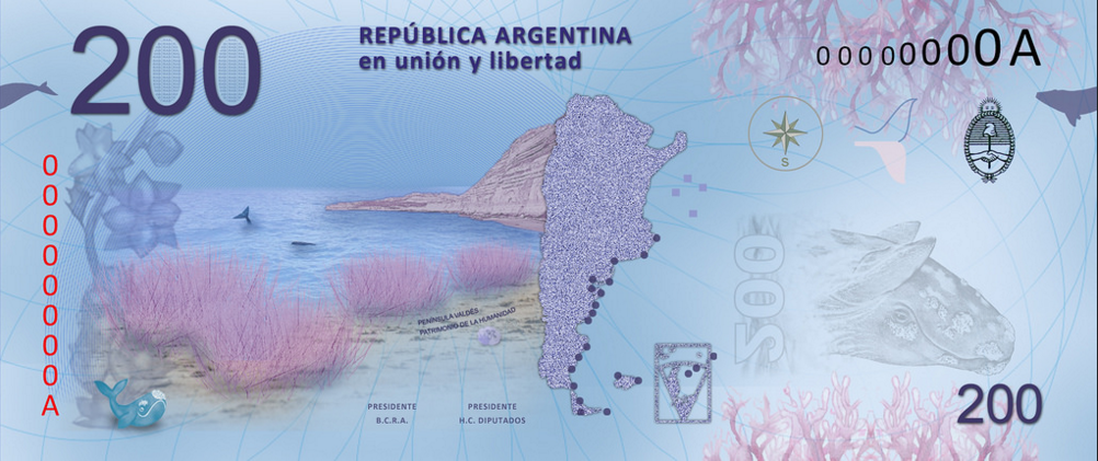Bankovka v hodnotě 200 pesos má barvu moře a vyobrazuje velrybu jižní vynořující se z vody. Tento kytovec je typickým představitelem fauny v Argentinském moři. Každoročně se v sezóně od května do prosince u pobřeží argentinského města Puerto Madryn vyskytuje okolo 4.000 velryb, jejichž pozorování je velkým turistickým lákadlem. Poloostrov Valdés, na kterém se letovisko Puerto Madryn nachází, je také motivem na rubu nové argentinské bankovky.