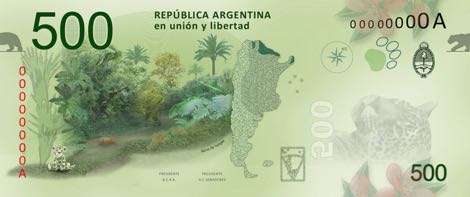 Bankovka nové řady v hodnotě 500 pesos je zelené barvy a vyobrazuje jaguára amerického, který je na území Argentiny vysoce ohroženým druhem. Podle odhadů se v zemi vyskytuje posledních přibližně 250 kusů této šelmy. Líc nové argentinské bankovky se pyšní detailním portrétem jaguára, na rubu se pak nachází umělecké ztvárnění tropického lesa, jaguárova přirozeného životního prostředí.
