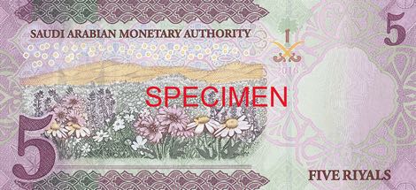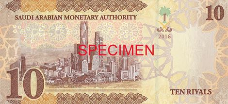 Na fialové 5rijálové bankovce je vyobrazený jiný známý symbol Saudské Arábie, a to ropná rafinérie. Hnědá 10rijálová bankovka zase nabízí majestátní pohled na hlavní město země, Rijád.