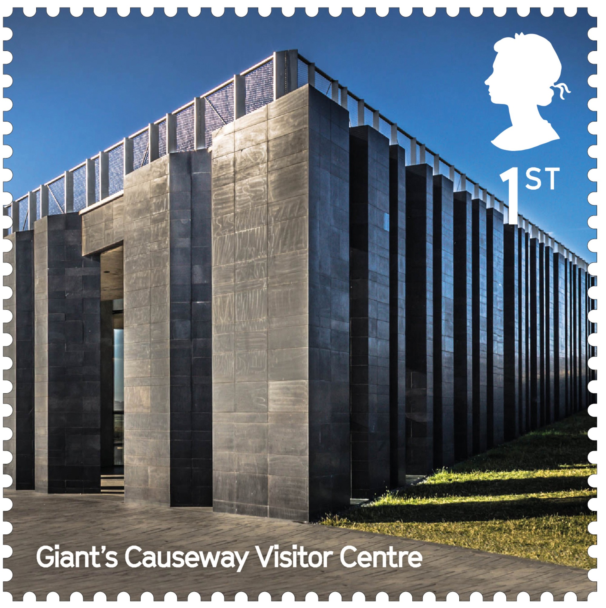 Severní Irsko na známkách připomíná budova návštěvnického centra pro oblast Giant’s Causeway (doslova „Obrův chodník“). Jde o geologicky jedinečný útvar sestávající se z čedičových sloupů sopečného původu, které návštěvnické centrum svou architekturou imituje.