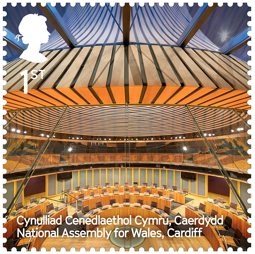Z Walesu se na nové britské známky dostala budova Velšského národního shromáždění, což je obdoba parlamentu s vymezenými místními legislativními pravomocemi. Velšské národní shromáždění sídlí v hlavním městě Cardiff v objektu Senedd (v překladu „Senát“), který byl postavený podle návrhu architekta Richarda Rogerse a zasedá se v něm od roku 2006.