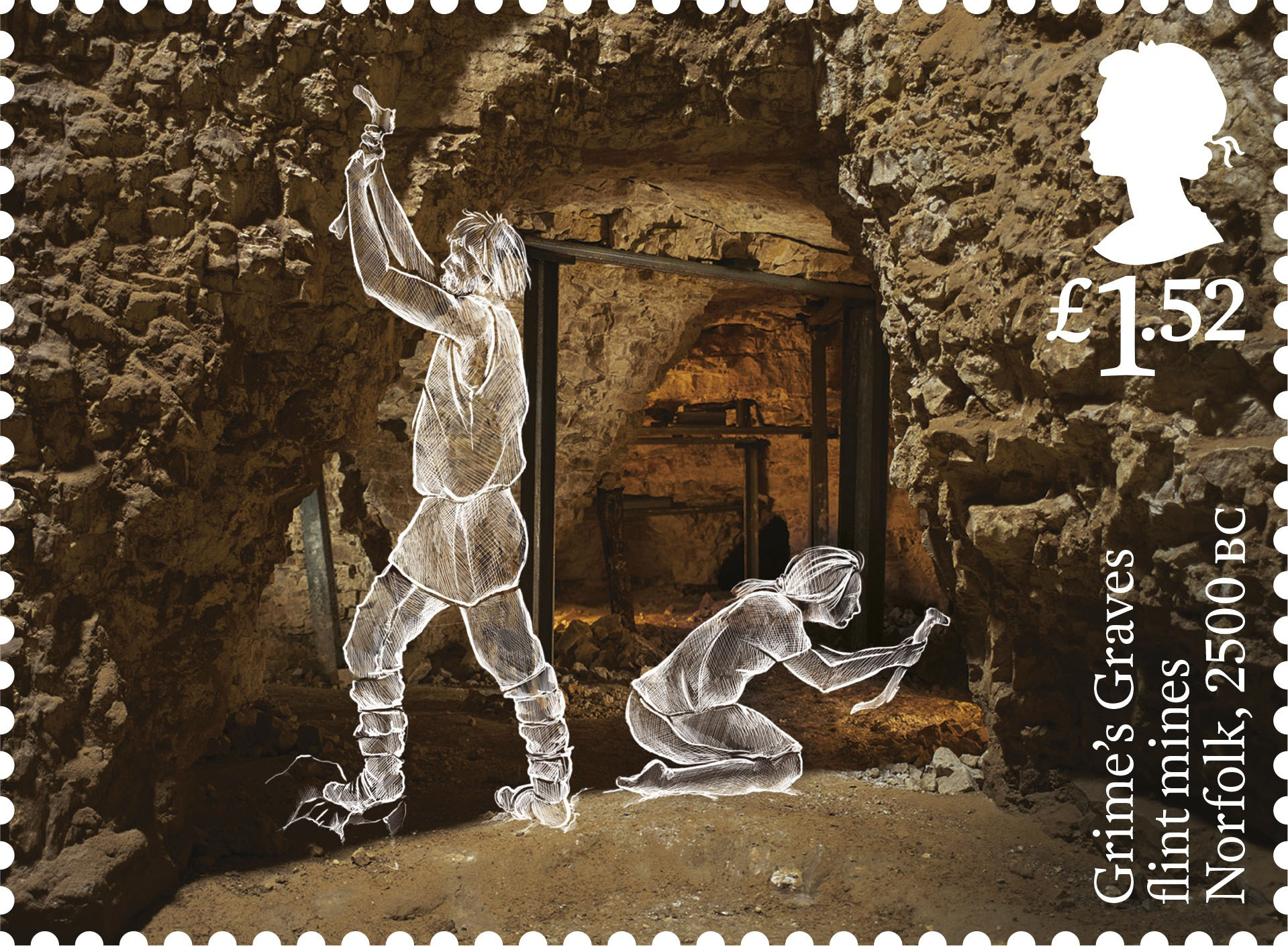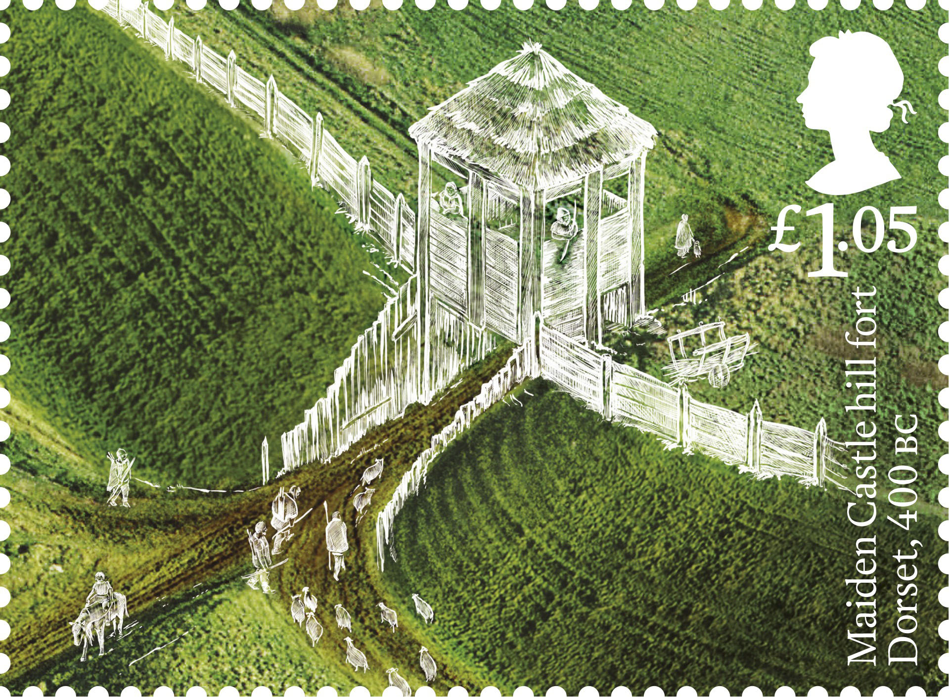 Na nové britské známky se dostalo i rozlehlé hradiště Maiden Castle v hrabství Dorset, jehož mohyly a zemní ohrazení pocházejí z období neolitu. Posledním vyobrazenou lokalitou je komplex Grime’s Graves v anglickém Norfolku, kde se ve třetím tisíciletí před naším letopočtem těžil pazourek.