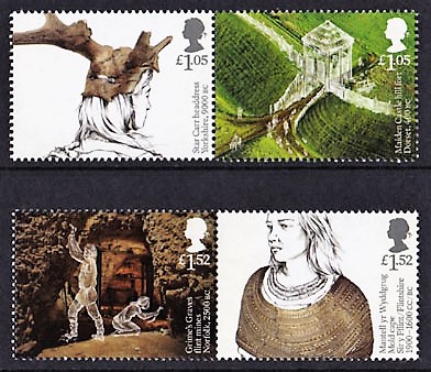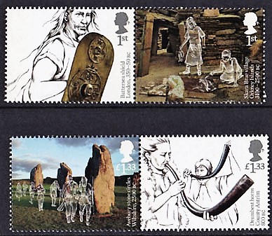 Nové britské známky ukazují například tři kamenné kruhy z mladší doby kamenné, které obklopují obec Avebury v jihozápadní Anglii. Rovněž z mladší doby kamenné pochází neobyčejně zachovalá vesnice Skara Brae, sestávající se z osmi kamenných domů nacházejících se na největším ze skotských Orknejských ostrovů. Osada Skara Brae je starší než známější Stonehenge, dokonce starší než velké egyptské pyramidy, a obydlená byla tři tisíce let před naším letopočtem.
